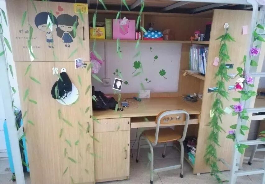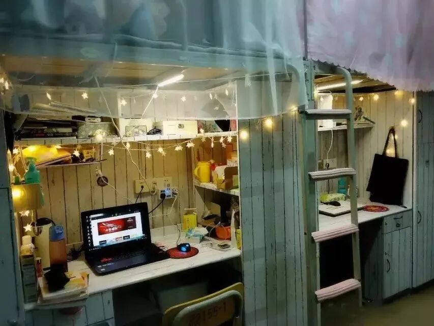 主要分为4人间和6人间,都是上床下桌,东西区全部装了空调,每个宿舍3台风扇,3~4盏电灯,有饮水机(大叔会送上门)。