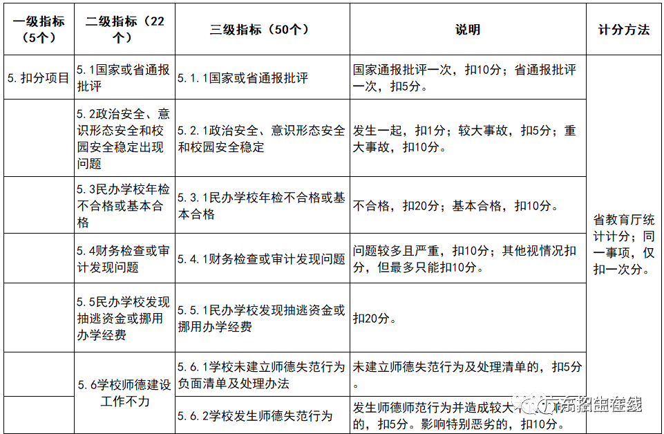 由于考核中包含了“扣分项目”这一指标,部分被扣分院校的考核总分也会受到影响。根据不同指标及实际情况,扣分分值在1-20分之间。具体的扣分指标如下: