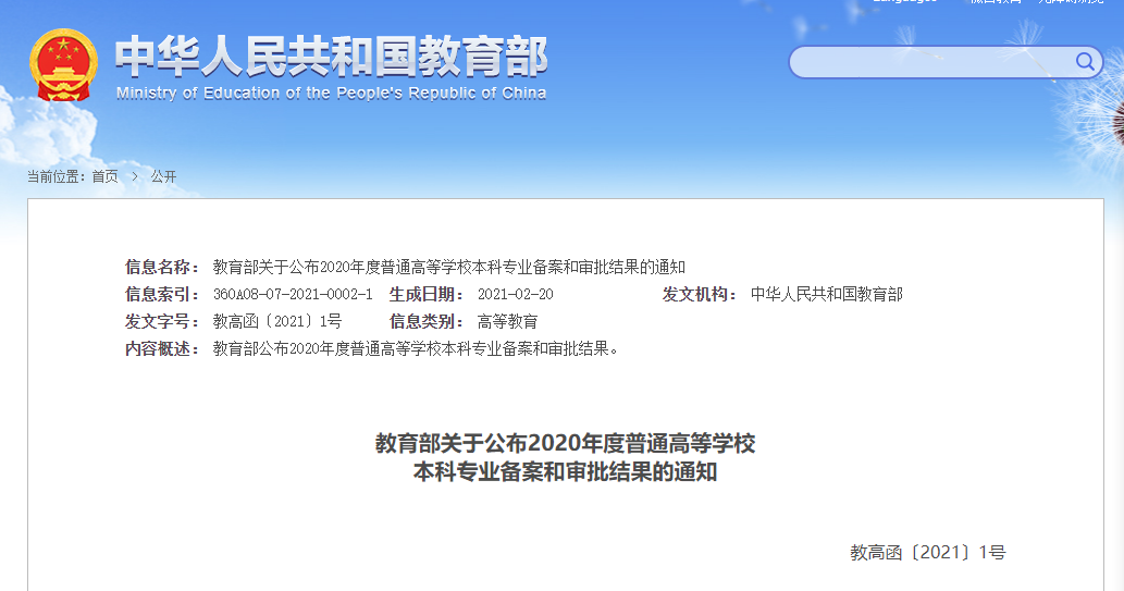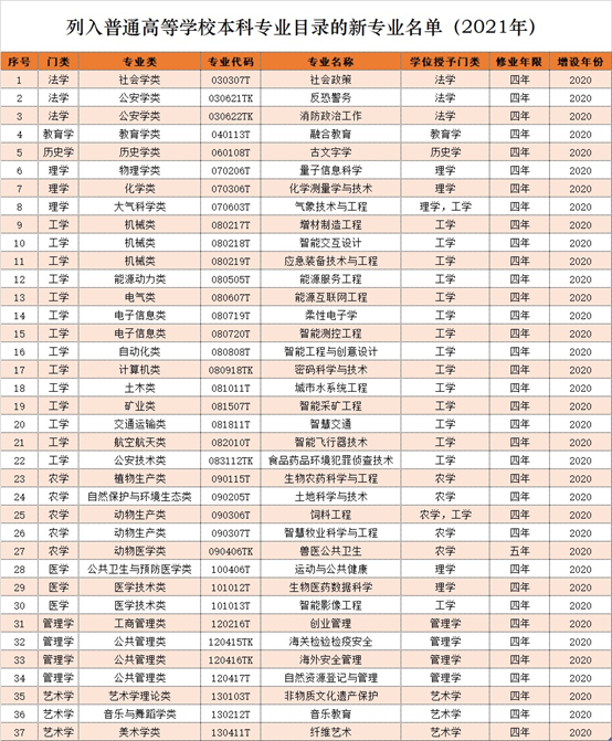 3月1日,教育部公布了2020年度普通高等学校本科专业备案和审批结果。其中,37个新专业列入《普通高等学校本科专业目录》;各高校新增备案专业2046个,新增审批专业177个,调整学位授予门类或修业年限专业93个,撤销专业518个。