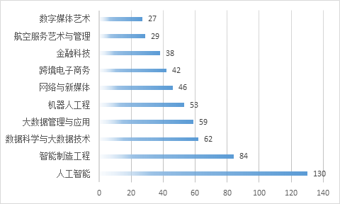 人工智能、智能制造工程、数据科学与大数据技术、大数据管理与应用、机器人工程可谓此次新增专业中的大热门,新增数量排名前五。仅人工智能一个专业,就有包括清华大学、北京语言大学、华北电力大学等在内的130所高校增设。