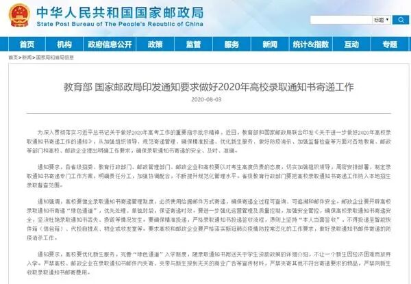 去年,教育部和国家邮政局联合印发《关于进一步做好2020年高校录取通知书寄递工作的通知》。