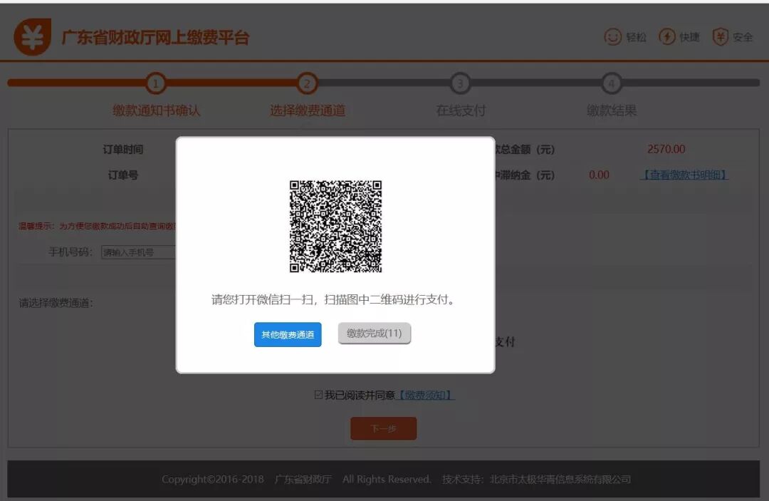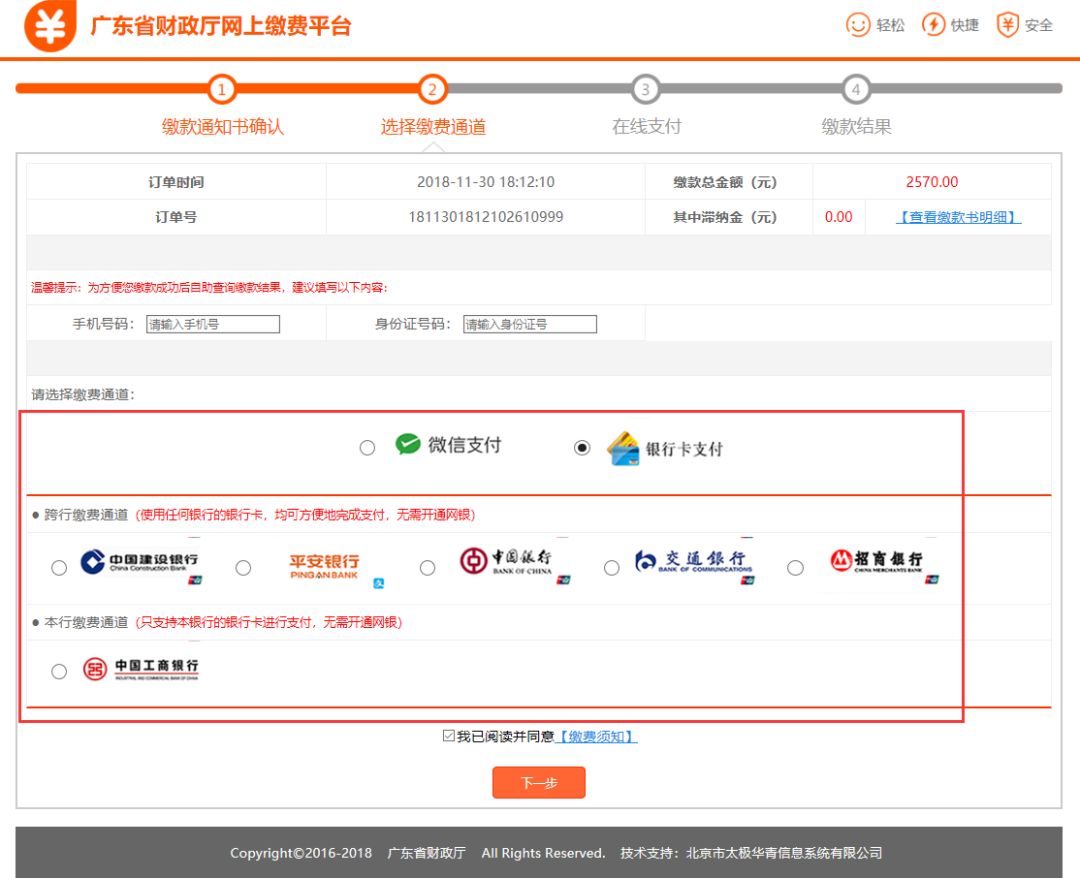 • 点击我已经阅读并同意按钮,进入选择缴费通道页面: