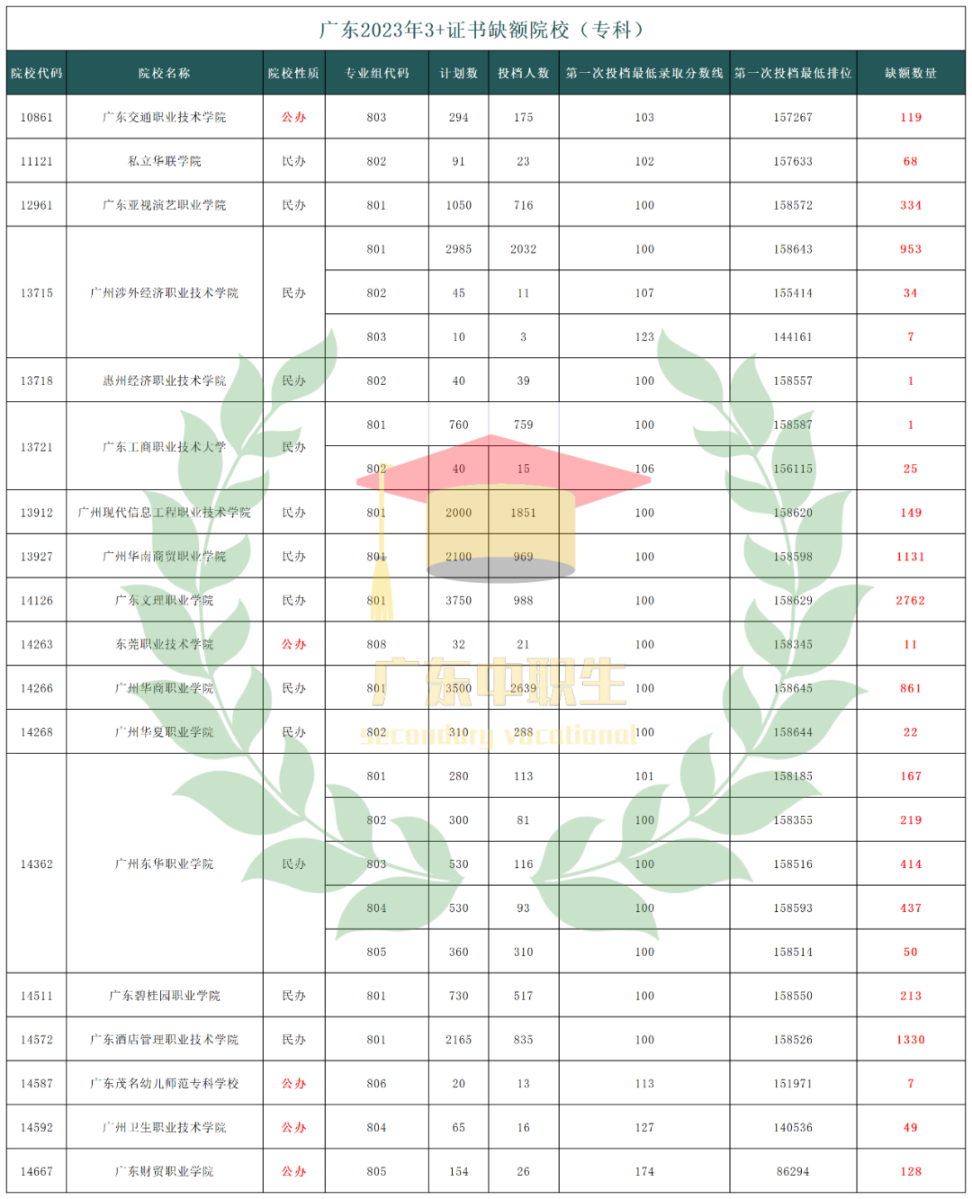 “3+证书”专科中职生批次一次性满档院校专业组有305个,满档率为92.4%,其中民办专科院校一共有43个专业组招生,25个专业组缺额,下面为缺额院校专业。