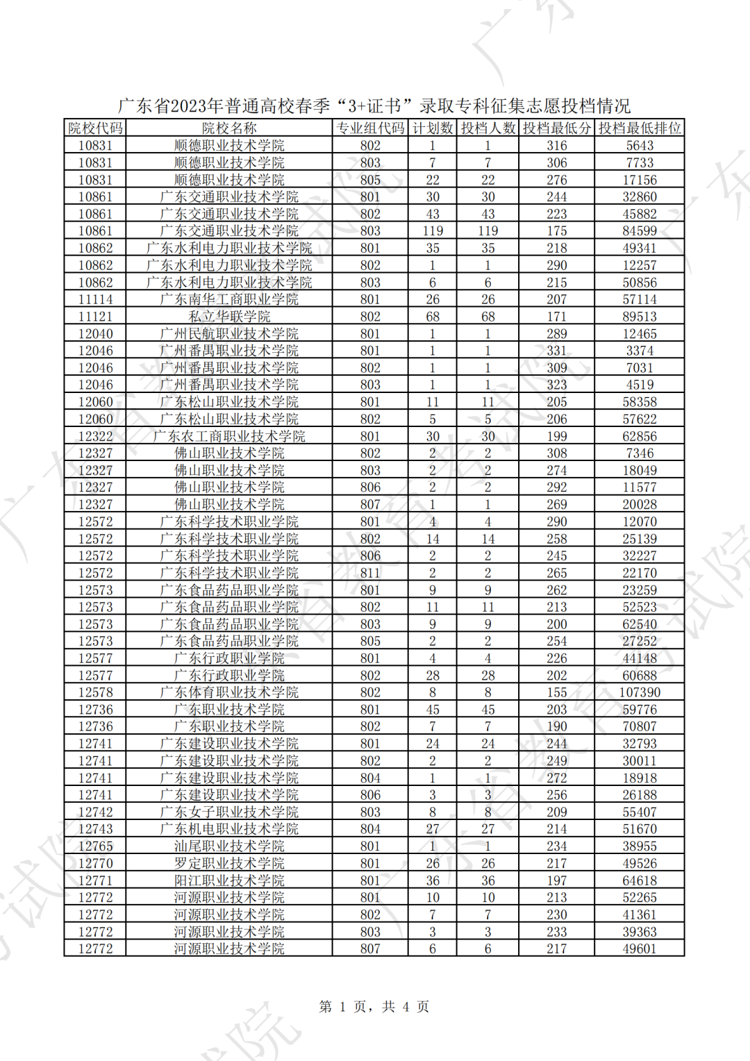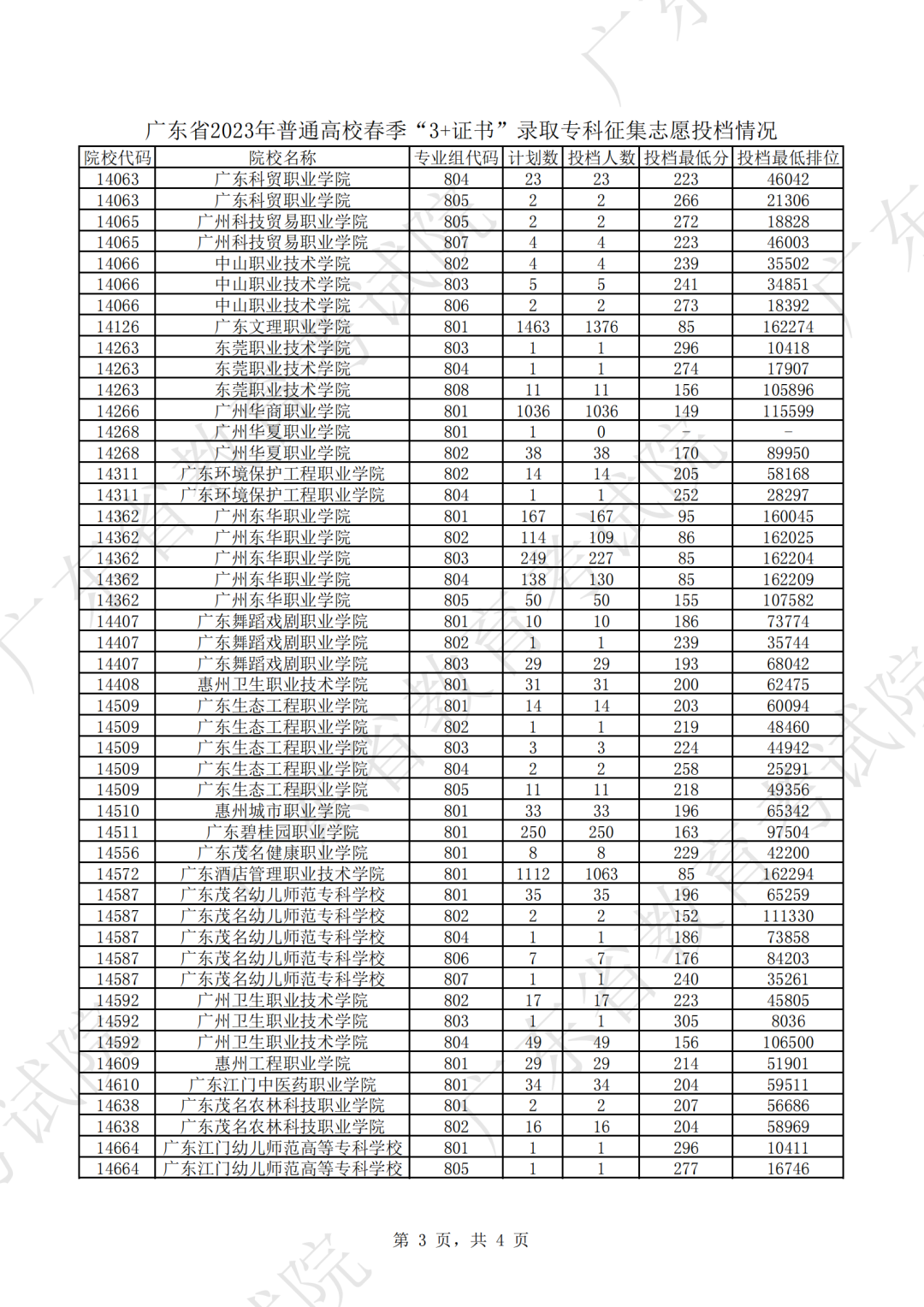 专科情况:“3+证书”专科中职生批次一次性满档院校专业组有305个,满档率为92.4%。其中,地处经济发达城市且办学基础较好的院校及国家“双高计划”建设院校均一次性满档,且投档最低分也较高。