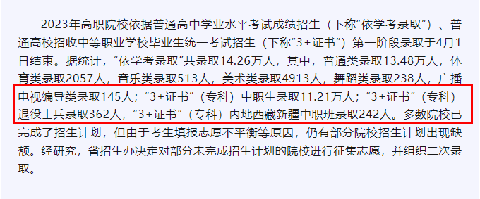 我们按照报考16.6万人和录取12.2万人计算,2023年报考3+证书录取率大概在73%。如果报考人数更多的话,这个比例则会更低。