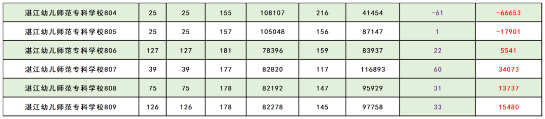 涨幅前3的学校分别是:广东江门幼儿师范高等专科学校803(+142)、中山职业技术学院806(+107)、广东茂名健康职业学院802(+87)。