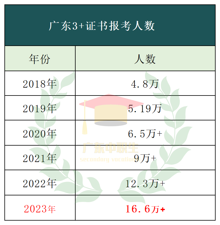 广东中职生参加3+证书考试人数创新高,2023总报名人数超16万,相比2020年的6.5万人增幅巨大。