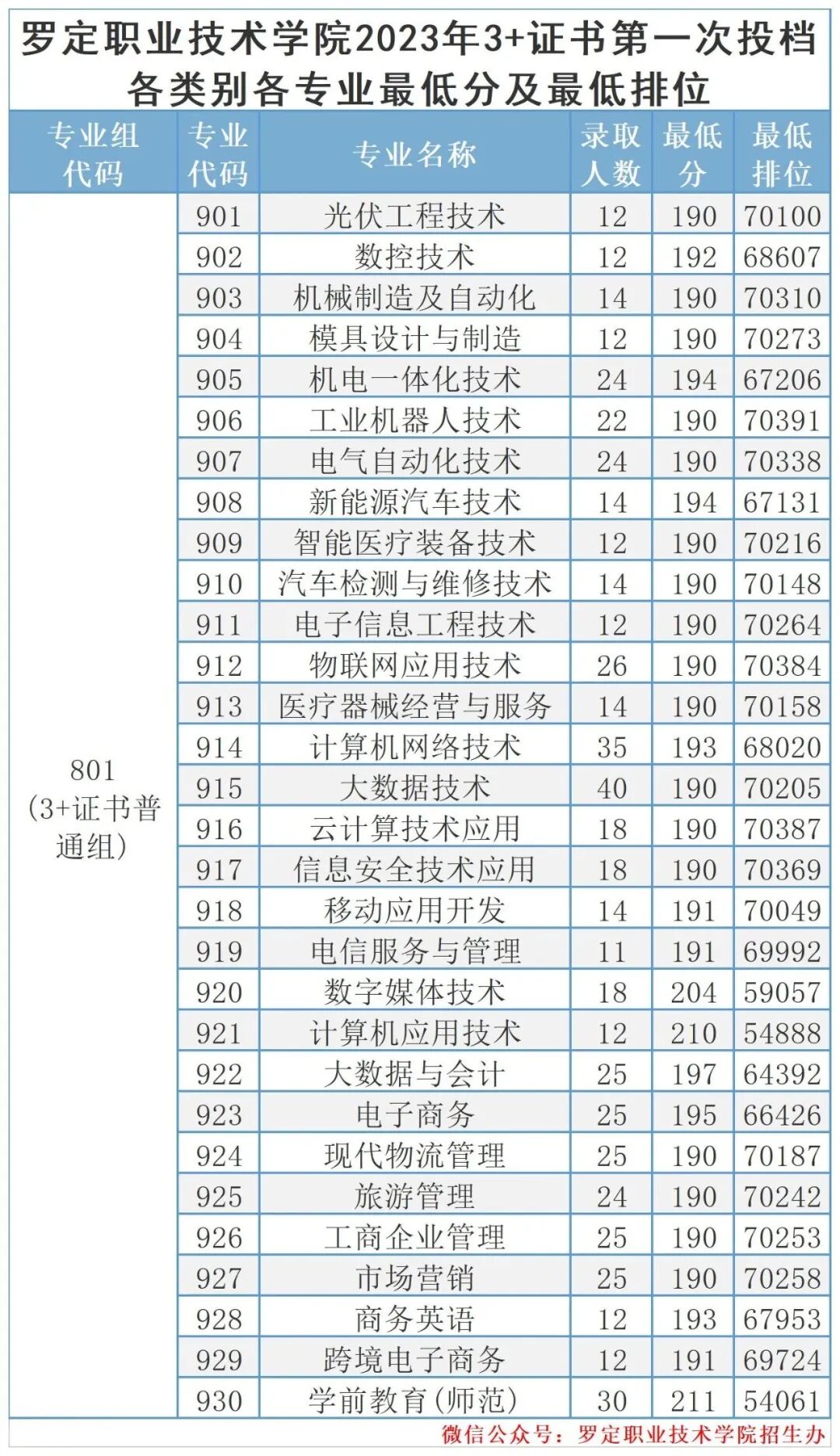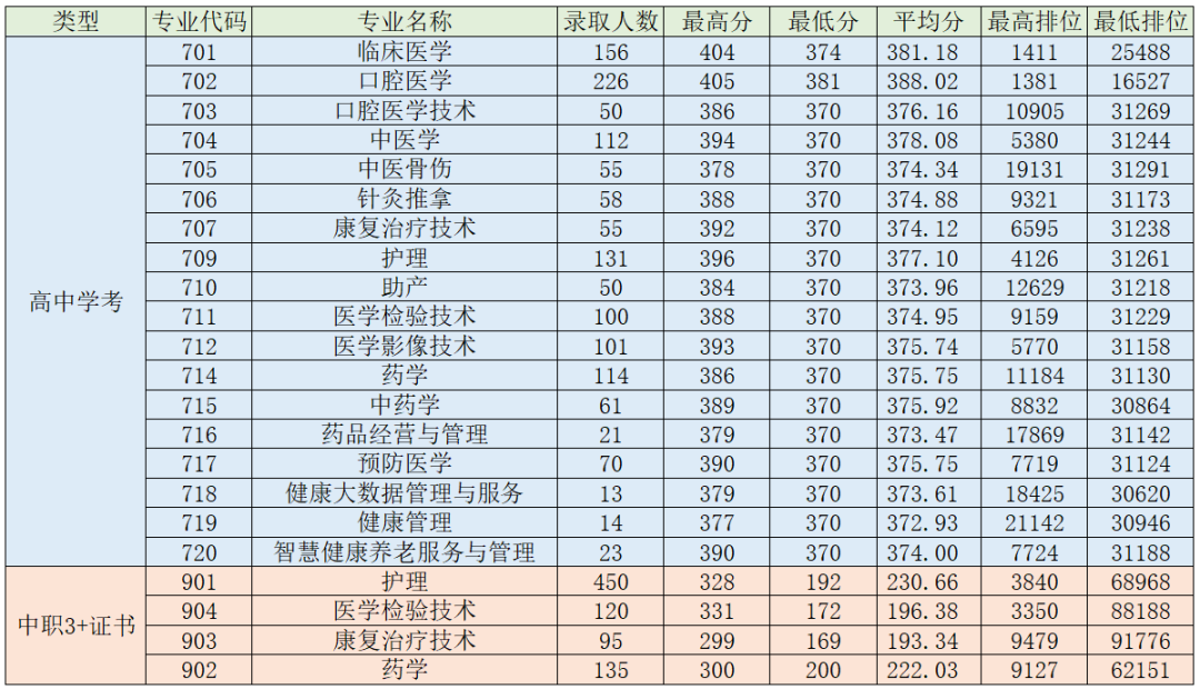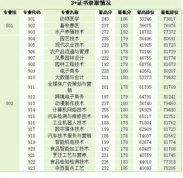 “3+证书”招录880人,最高361分,省内排位716;最低205分,省内排位58221。