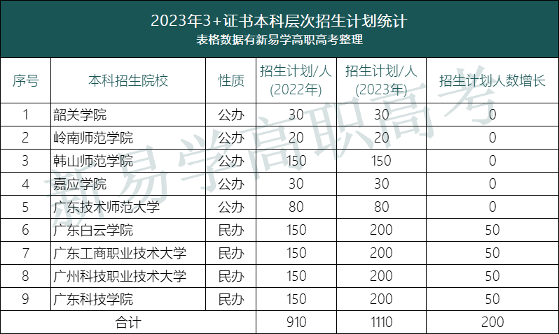 自从3+证书可以考本科以来,本科招生计划人数每年都在增加,由2018年的200人,2022年的910人,到2023年1110人,稳中有升。除了人数外,可以报考的本科大学也变多了,其中韩山师范学院、广东科技学院还增加了招生专业,而民办本科对口的证书要求则相对宽松。