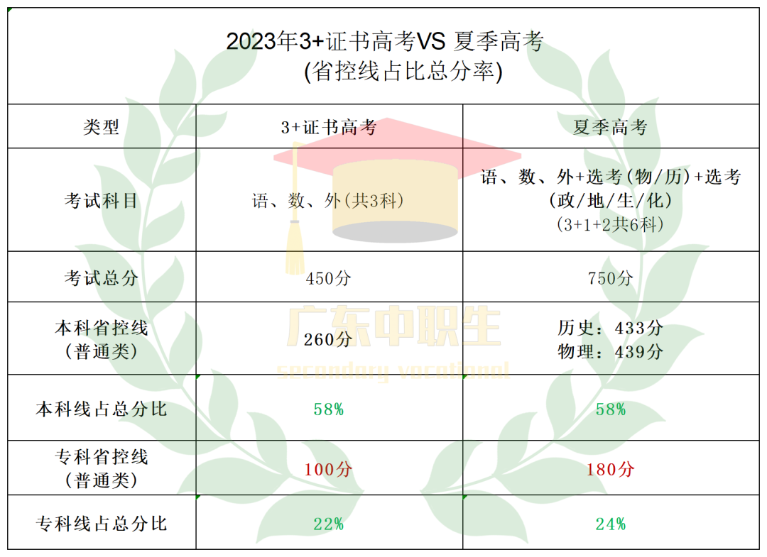 通过对比其实不难看出,相对于夏季高考,无论本科批次还是专科批次,3+证书高考录取分数线要低很多。当然,这与考试科目、分值、试题难度等不同都有关系,仅从省控线划线分值的角度来说,中职生通过3+证书高考上大学更为容易。