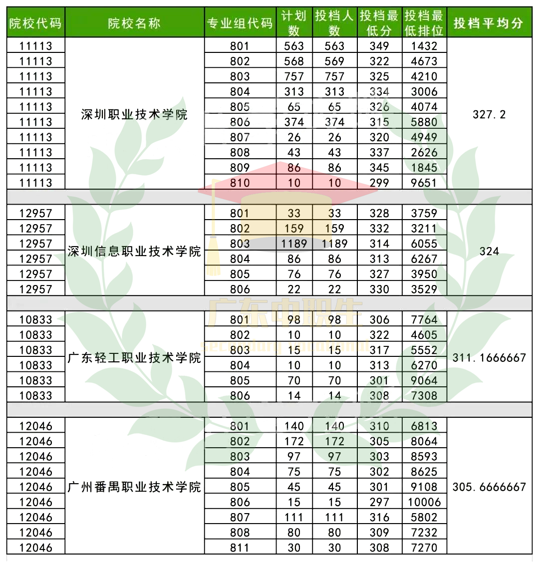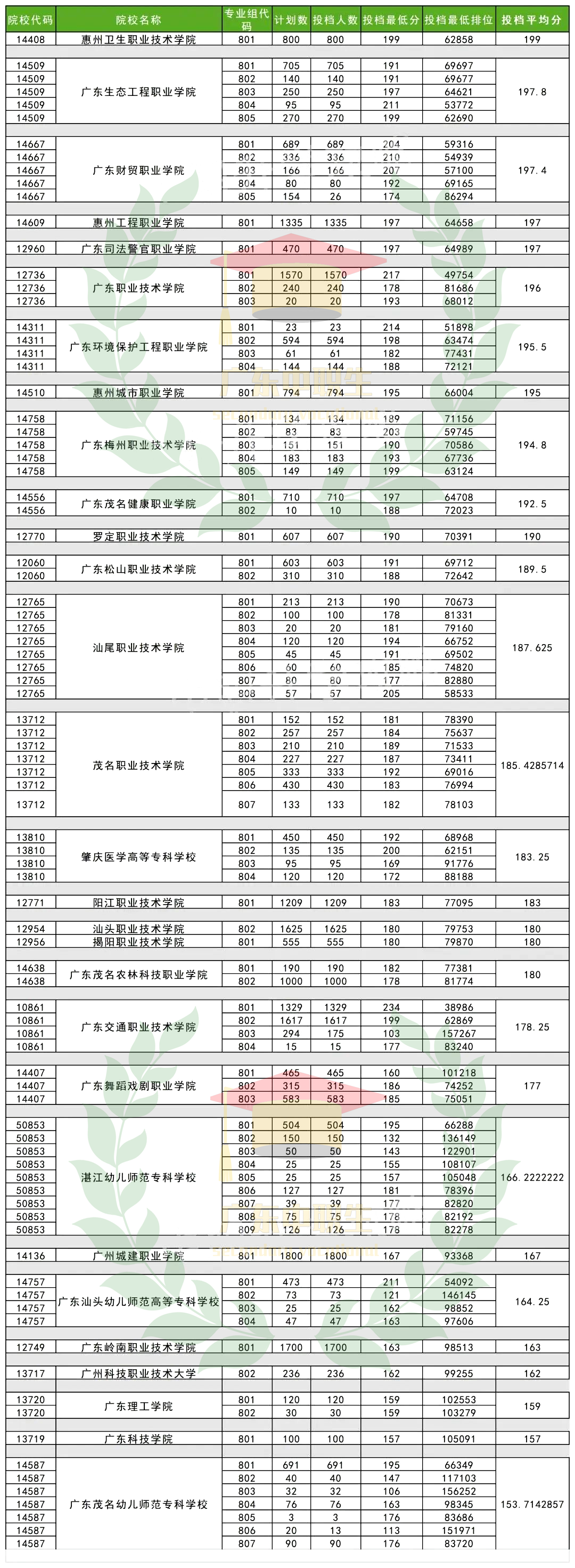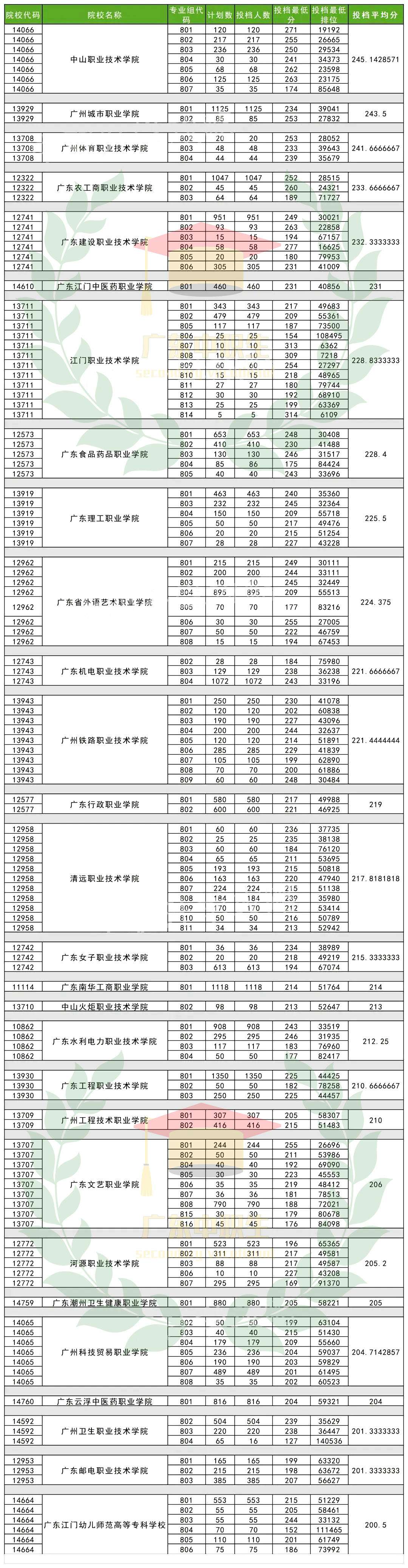 惠州卫生职业技术学院、广东生态工程职业学院、广东财贸职业学院、惠州工程职业学院、广东司法警官职业学院、广东职业技术学院、广东环境保护工程职业学院、惠州城市职业学院、广东梅州职业技术学院、广东茂名健康职业学院、罗定职业技术学院、广东松山职业技术学院、汕尾职业技术学院、茂名职业技术学院、肇庆医学高等专科学校、阳江职业技术学院、汕头职业技术学院、揭阳职业技术学院、广东茂名农林科技职业学院、广东交通职业技术学院、广东舞蹈戏剧职业学院、湛江幼儿师范专科学校、广州城建职业学院、广东汕头幼儿师范高等专科学校、广东岭南职业技术学院、广州科技职业技术大学、广东理工学院、广东科技学院、广东茂名幼儿师范专科学校