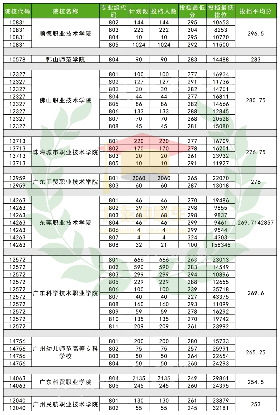 顺德职业技术学院、韩山师范学院、佛山职业技术学院、珠海城市职业技术学院、广东工贸职业技术学院、东莞职业技术学院、广东科学技术职业学院、广州幼儿师范高等专科学校、广东科贸职业学院、广州民航职业技术学院
