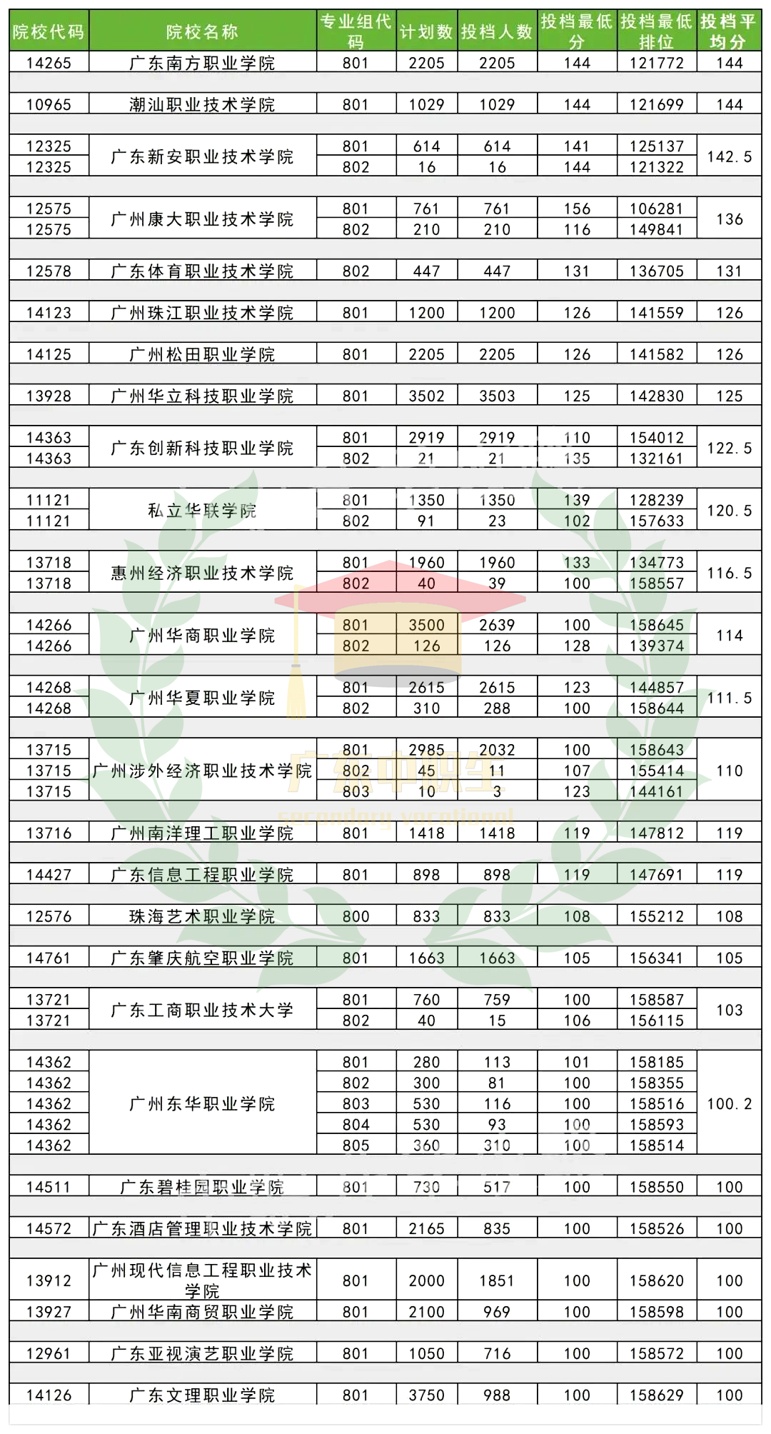 中山职业技术学院、广州城市职业学院、广州体育职业技术学院、广东农工商职业技术学院、广东建设职业技术学院、广东江门中医药职业学院、江门职业技术学院、广东食品药品职业学院、广东理工职业学院、广东省外语艺术职业学院、广东机电职业技术学院、广州铁路职业技术学院、广东行政职业学院、清远职业技术学院、清远职业技术学院、广东南华工商职业学院、中山火炬职业技术学院、广东水利电力职业技术学院、广东工程职业技术学院、广州工程技术职业学院、广东文艺职业学院、河源职业技术学院、广东潮州卫生健康职业学院、广州科技贸易职业学院、广东云浮中医药职业学院、广州卫生职业技术学院、广东邮电职业技术学院、广东江门幼儿师范高等专科学校