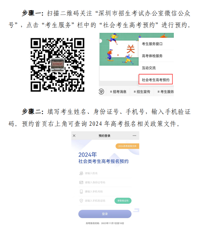 2023年10月28日起可通过“深圳市招生考试办公室微信公众号”考生服务栏目预约办理。预约成功的考生须按预约时间段持预约短信、报名材料到指定的社会报名点报名。