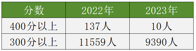 2023年的考生来看,高分人数明显降低很多,大多学生都位于150-250分左右!考上400分的只有10个人,而22年可是有137人!试卷的难度明显的提升!