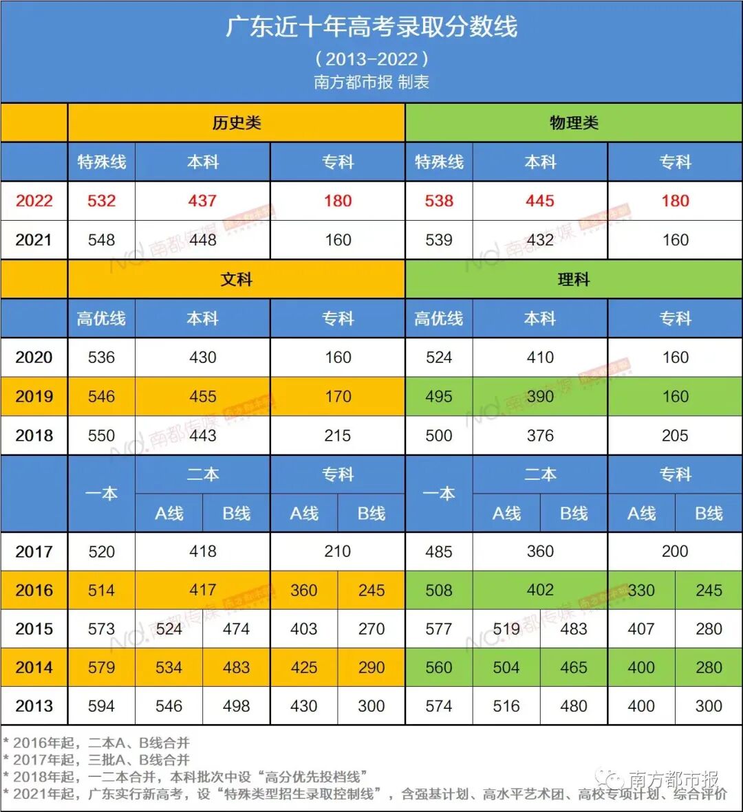 基本实现人人上大学的梦想。以广东为例,先看看近10年的广东高考录取分数线: