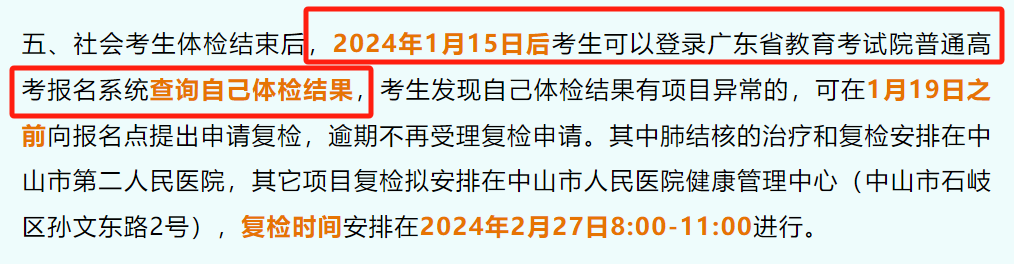 社会考生体检结束后,2024年1月15日后考生可以登录广东省教育考试院普通高考报名系统查询自己体检结果,考生体检项目有异常的,可在1月19日之前向报名点提出申请复检。