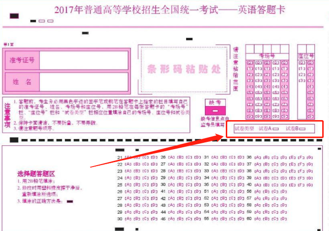 考试开始后,监考老师会下发试卷,这时考生才能知道自己拿到的是A卷还是B卷。答题卡上会有相应的选择框,用于填写对应的试卷类型。因此,在作答前,考生务必记得用2B铅笔正确填涂对应的试卷类型!如果因为漏填、错填、全填或字迹不清等原因导致答卷或答题卡无法正常评卷,责任将由考生自行承担。