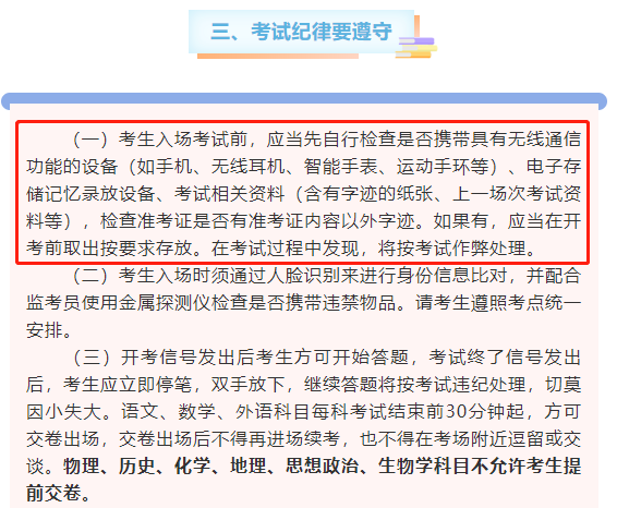 严禁携带各种无线通讯工具(如手机、无线耳机、智能手表等)、电子存储记忆录放设备、涂改液、修正带及不透明的文具盒(袋、套)、不透明水杯 (含饮料)等物品进入考场。