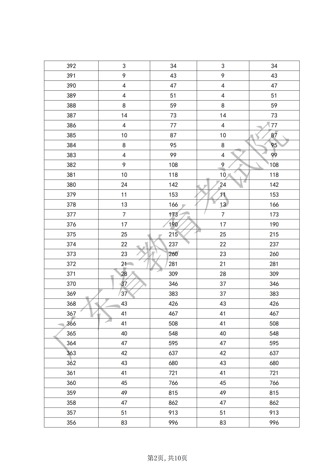 累计人数: 指的是这个分数段上的分数人数累加。比如300分累计人数为11559,表明300分及以上的人数共有11559人。