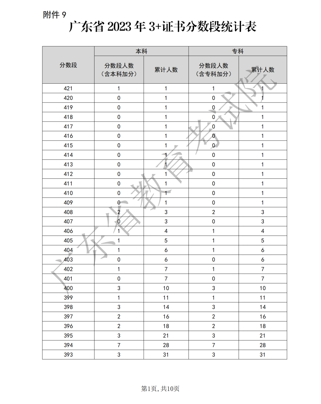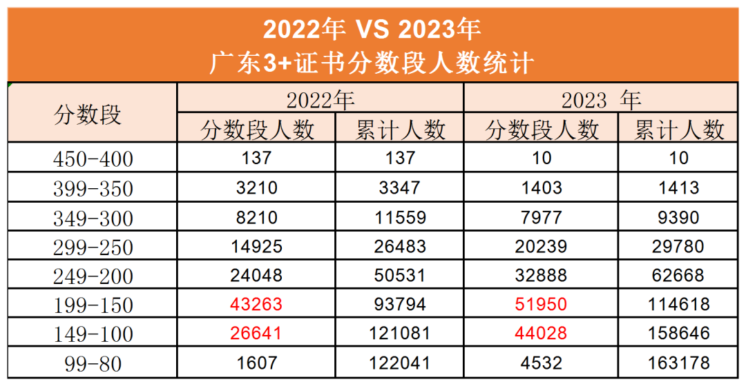 2023年3+证书“一分一段表”,是以“1分”为单位,统计获得该分数内的考生人数和累计人数,每一个分数段上有多少人一目了然。