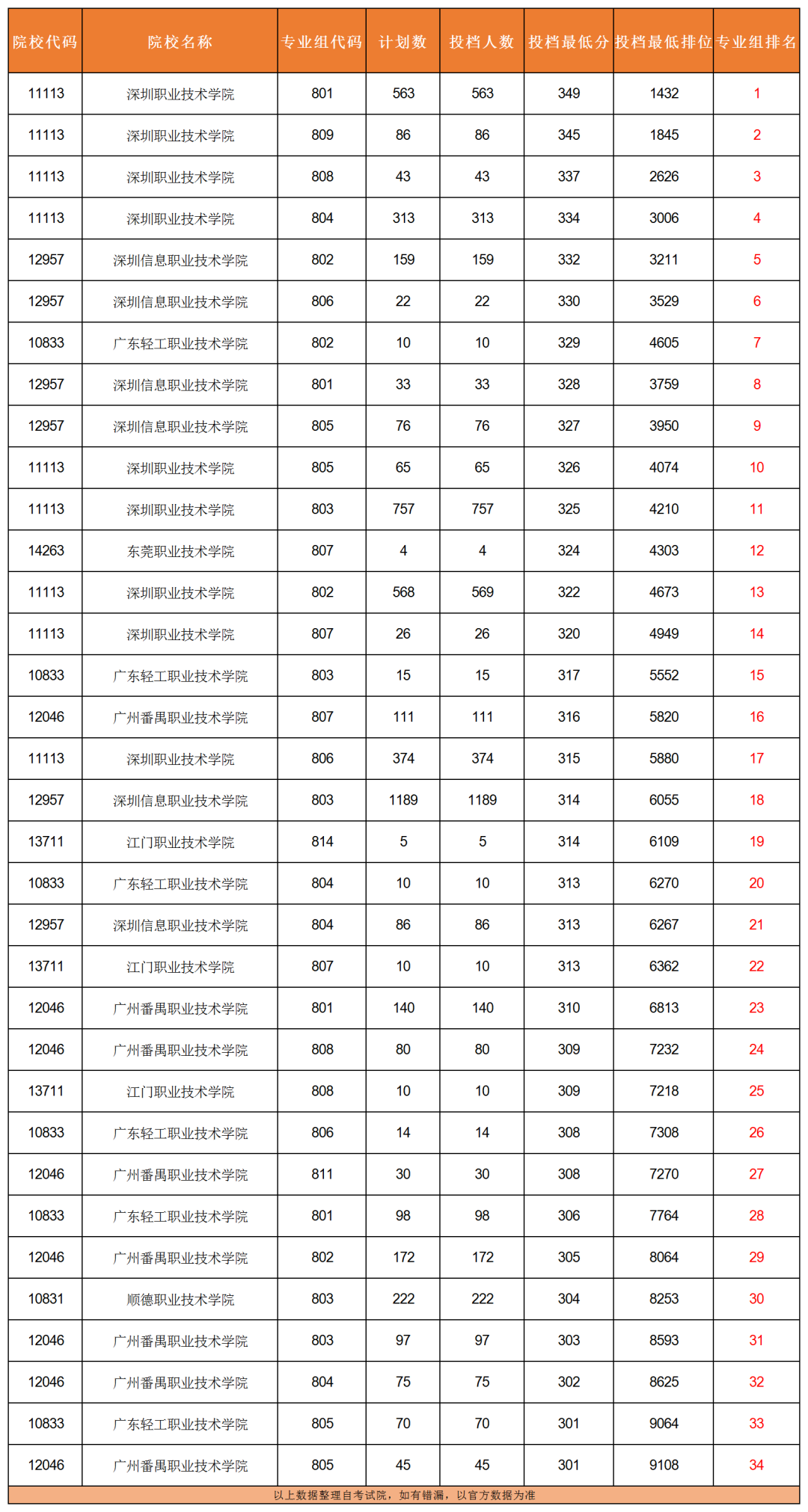 今年各个专业组的