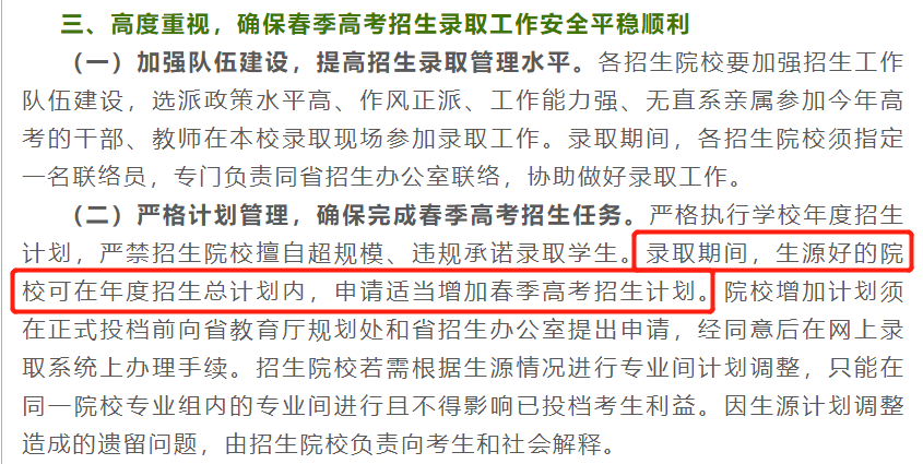 在省教育考试院公布的《关于做好广东省2023年普通高等学校春季考试招生录取工作的通知》中提到:录取期间,生源好的院校可在年度招生总计划内,申请适当增加春季高考招生计划。