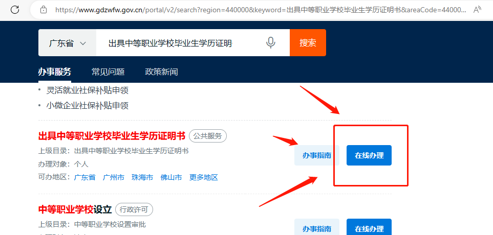 搜索“出具中等职业学校毕业生学历证明书”。