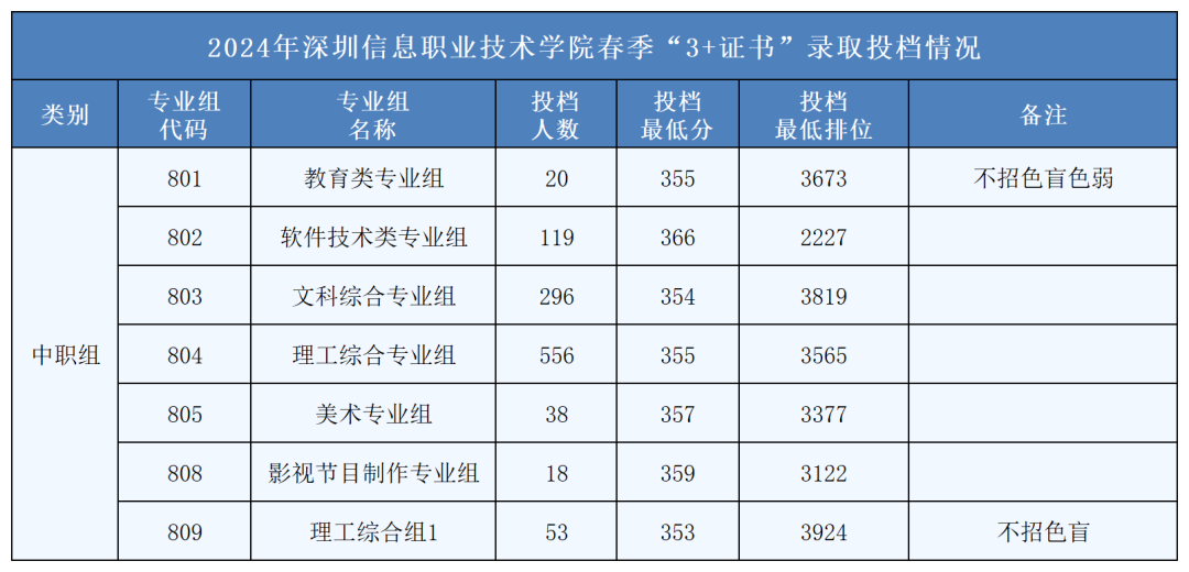 这是一个在意料之中的答案,今年TOP1依然是“全国第一”的深职大。深职院801专业组总投档353人,最低投档384排位649。
