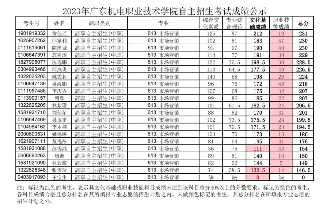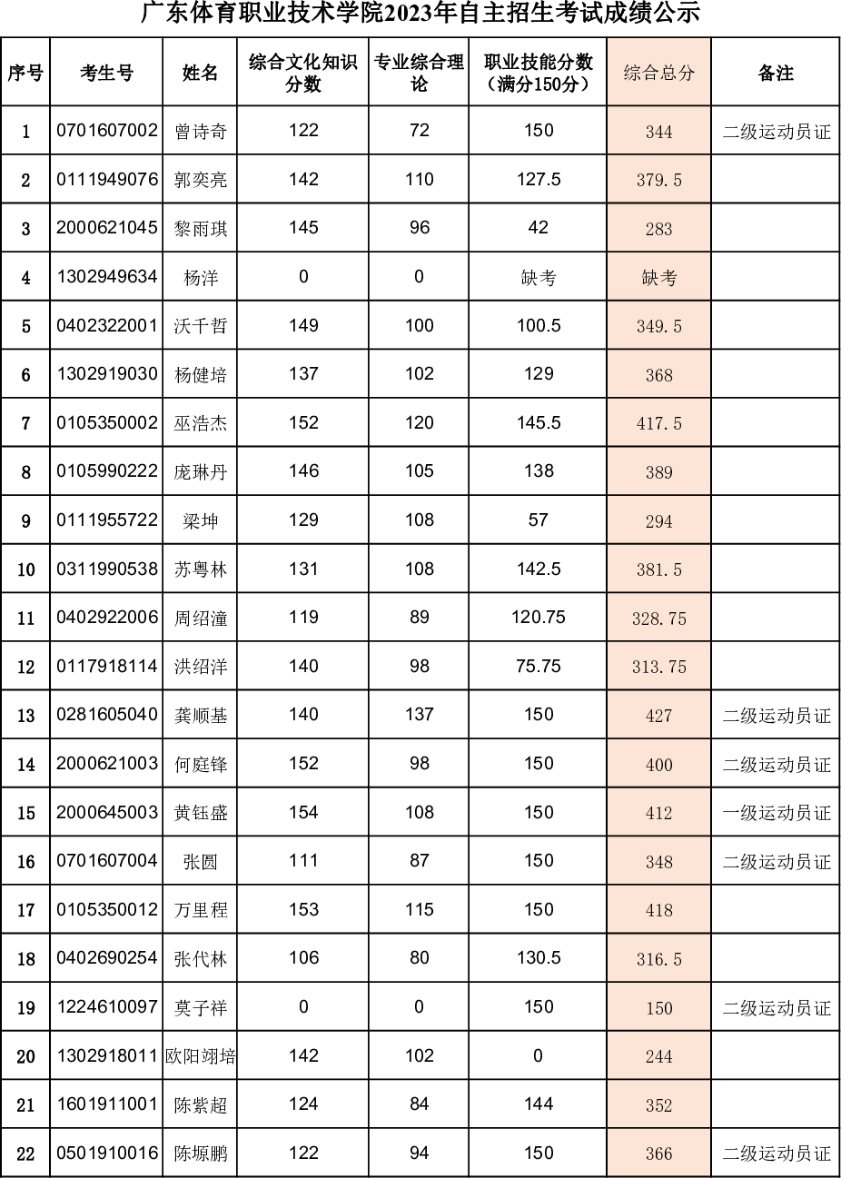 根据《关于做好2023年高等职业院校自主招生工作的通知》及广州体育职业技术学院招生工作相关规定,现公示我院2023年自主招生(含退役军人现代学徒制专项试点招生、面向高中生自主招生、面向中职生自主招生)考试成绩(见附件),公示期自2023年5月22日14:00至5月25日14:00。如对成绩有异议,可在公示期内(每天上午8:30-12:00,下午14:30-17:30)致电我院招生办(联系电话:020-85603035)申请复查,逾期不再受理。