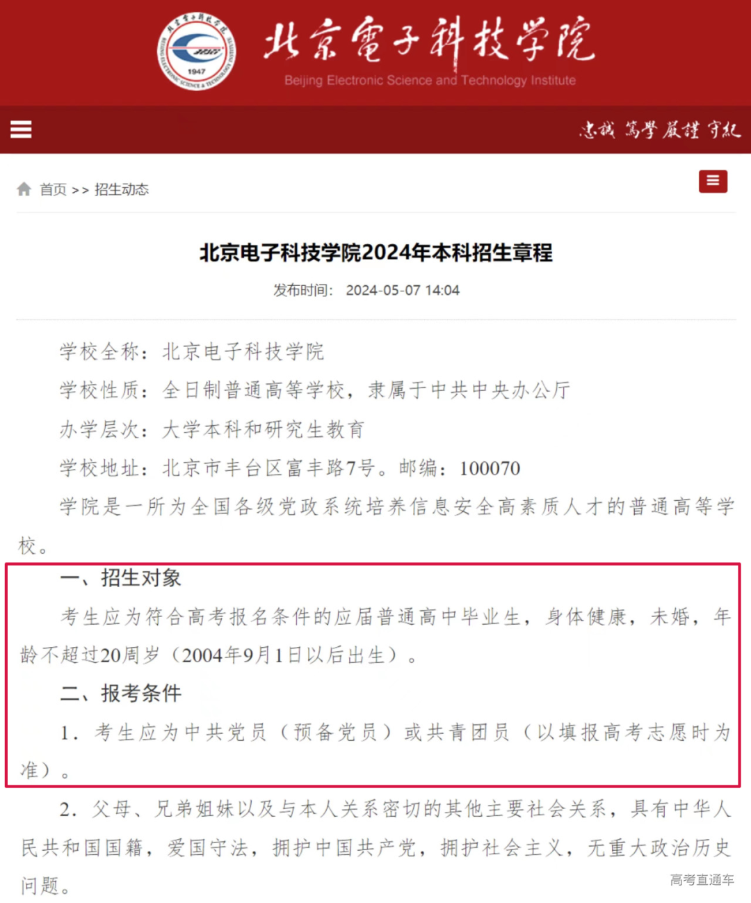 近日,北京电子科技学院已在官网率先公布2024年招生章程,招生对象仍明确指出“考生应为符合高考报名条件的应届普通高中毕业生,身体健康,未婚,年龄不超过20周岁(2004年9月1日以后出生)”。