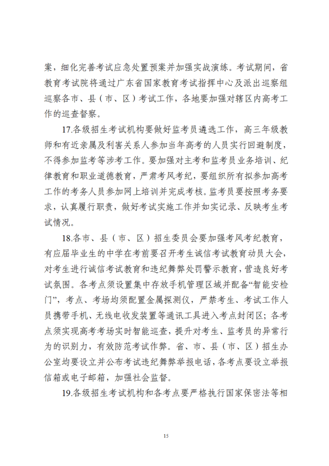 2.完善考试安全体系。各地各校要把安全保密工作摆在突出重要位置,强化命题、制卷、运送、保管、分发、施考、回收、评卷等关键环节和关键人员的管理,确保试题试卷绝对安全。强化标准化考点建设管理,加大人员入场检测力度,严格执行考生进入考点(考场)安全检查工作规范。开展手机作弊专项治理,加强考点无线电信号屏蔽设备配备,实行考点集中存放手机管理并实现“智能安检门”升级完善;严厉打击考试舞弊,实现高考考场实时智能巡查和保密室实时智能巡检全覆盖,进一步完善防范高科技作弊的工作措施。加强部门协作机制,开展净化涉考网络环境、净化考点周边环境、打击销售作弊器材、打击替考作弊等专项行动,综合治理考试环境,依法严厉打击各类涉考违法犯罪活动。加强考生诚信考试教育,营造良好风气。加强考务工作人员培训,严防发生考试事故。加强监考巡考工作,严格执行考场视频回放制度,严查违规违纪行为。