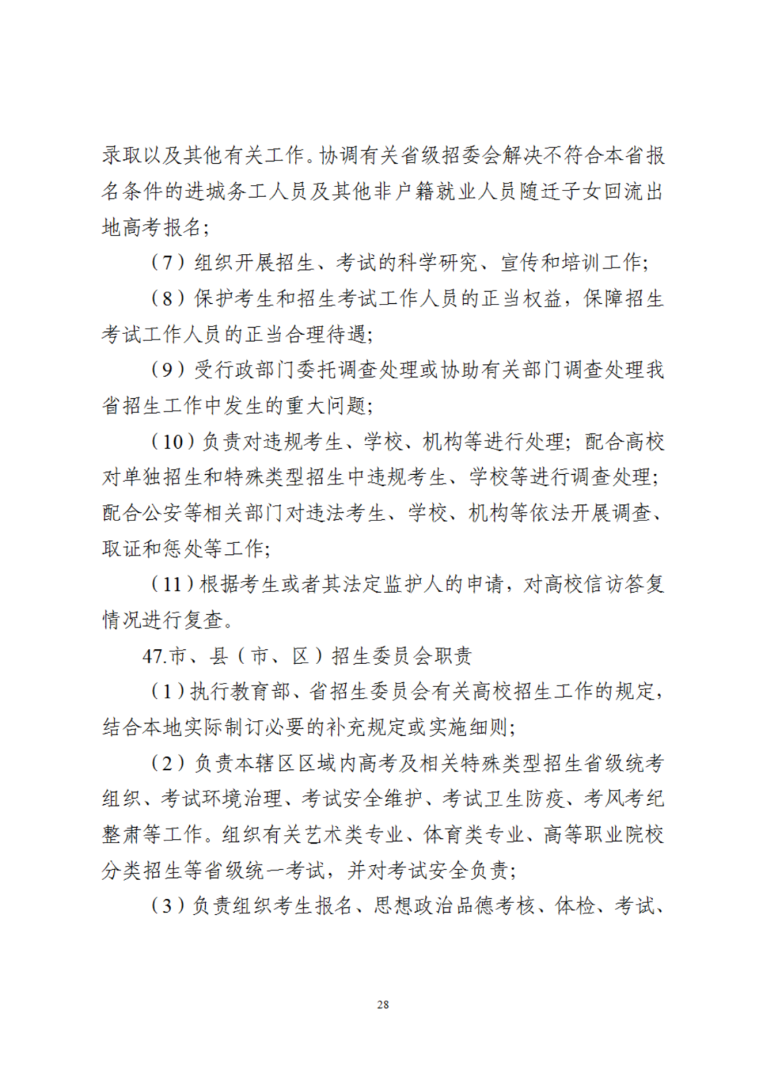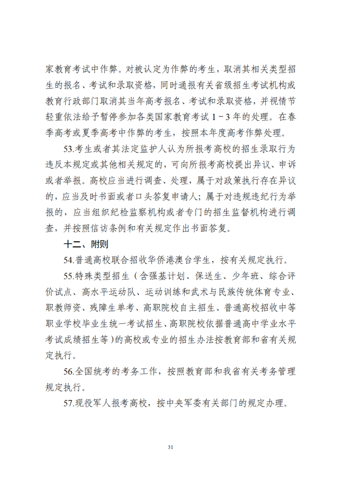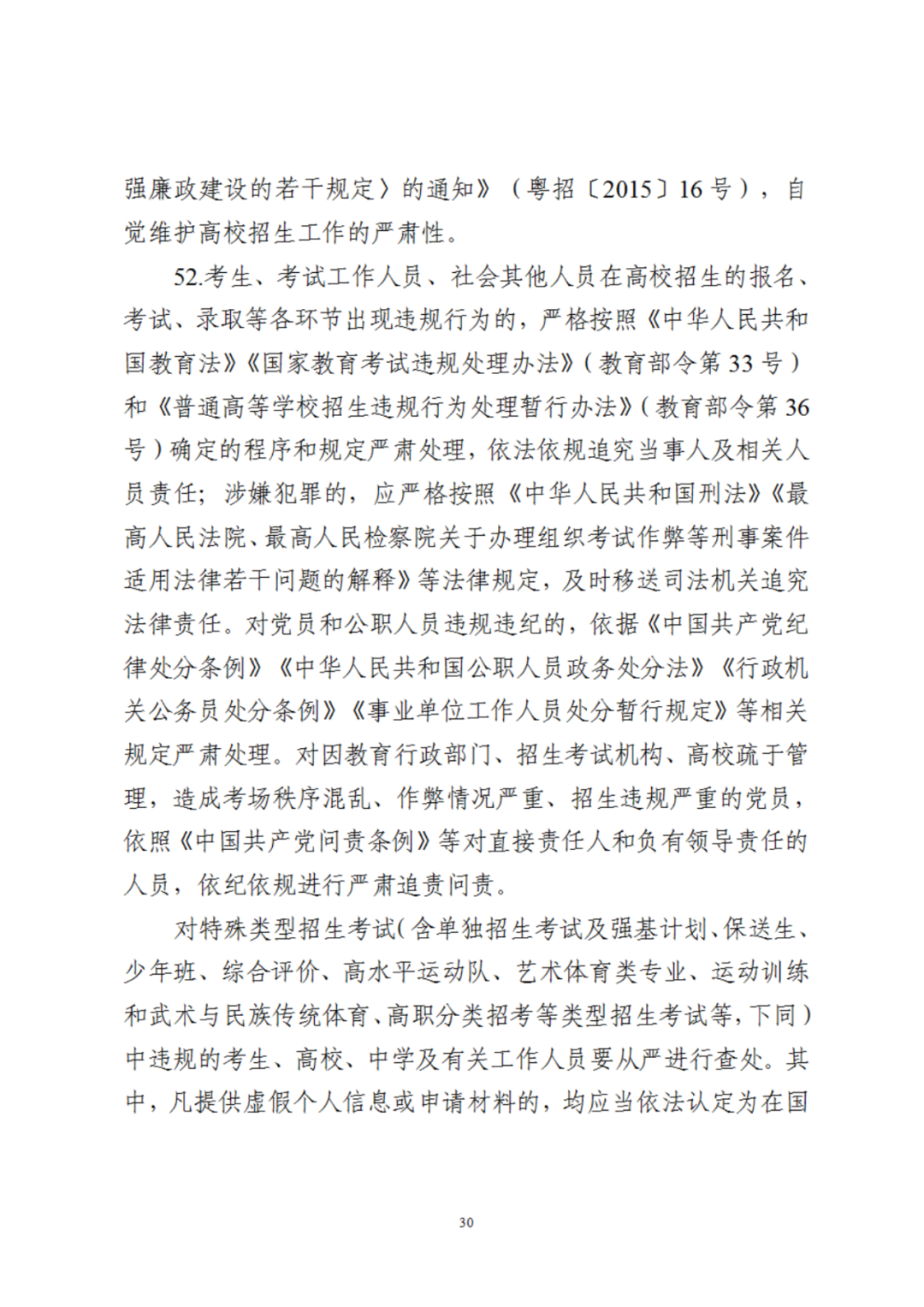 11.严格执行招生政策。各地各校要严格执行国家招生计划和招生政策规定,严肃招生工作纪律,认真遵守高校招生“30个不得”“八项基本要求”等工作纪律,切实维护招生工作的严肃性。高校招生委员会、教育行政部门要认真落实考试招生工作的监管责任,会同教育纪检部门加强对报名、考试、录取全过程监督。要认真做好所属高校招生章程及属地高校的有关特殊类型招生办法的审核工作,对相关高校招生政策及计划执行情况开展督促检查。要严格组织新生入学资格复查,确保招生录取公平公正。