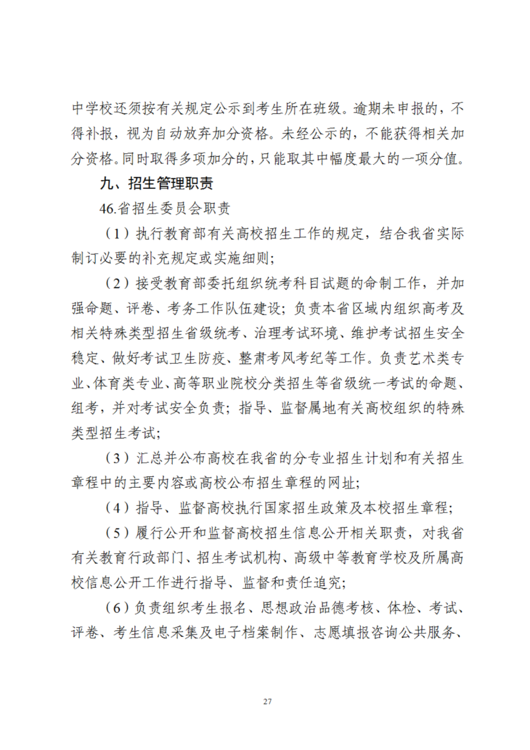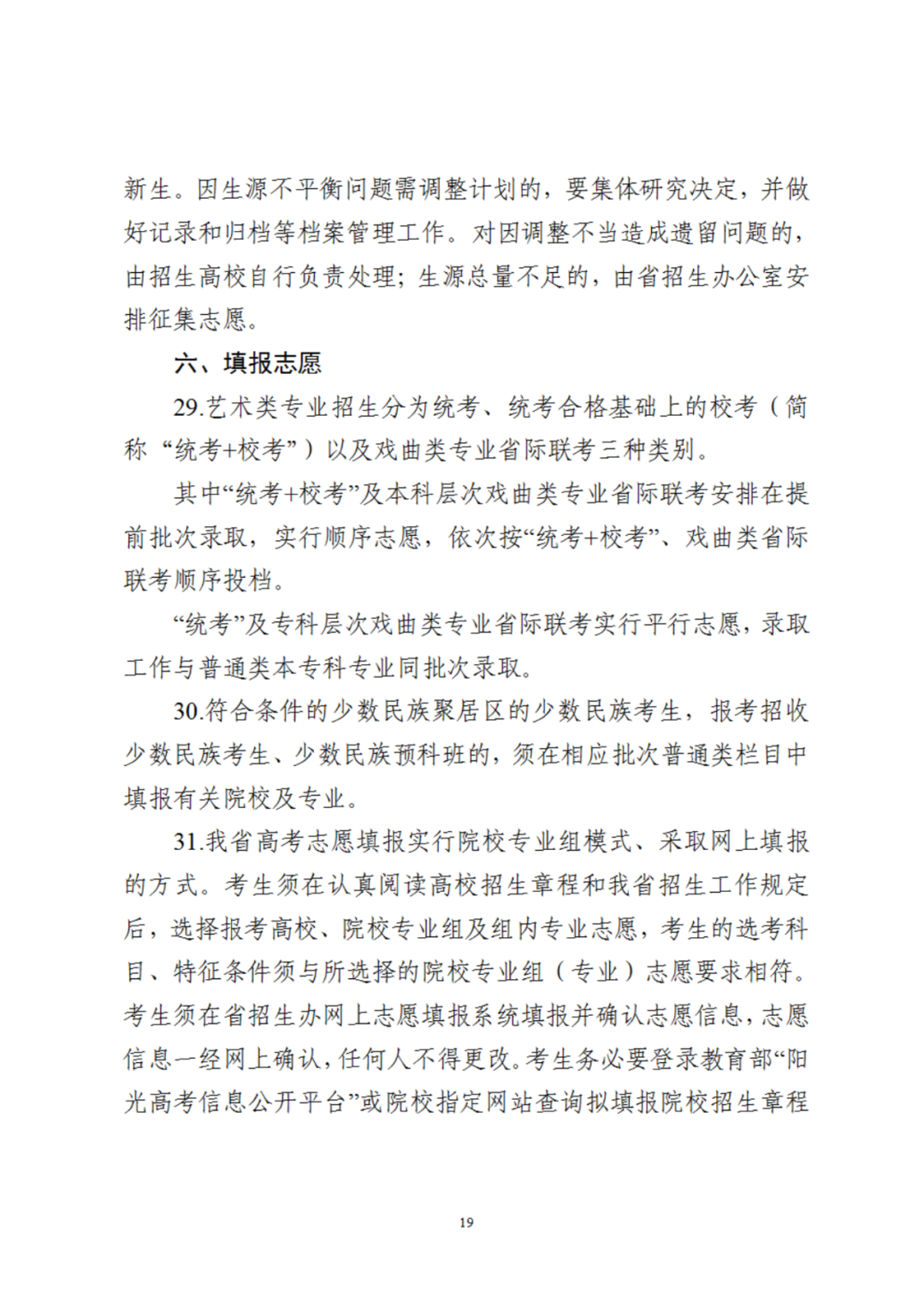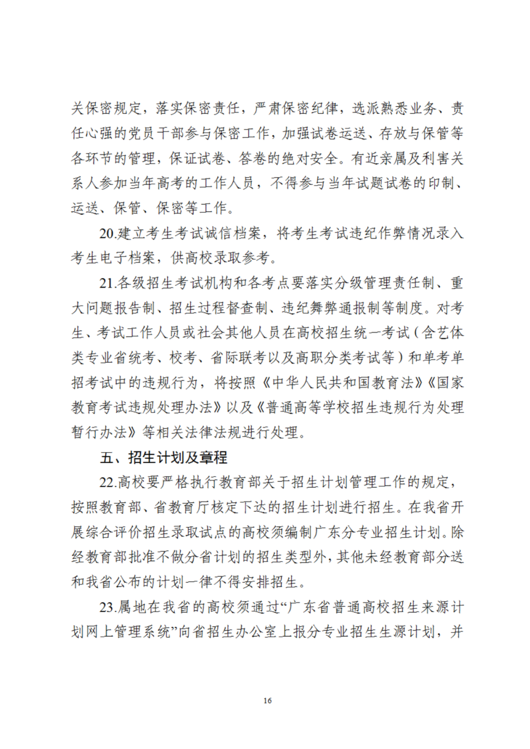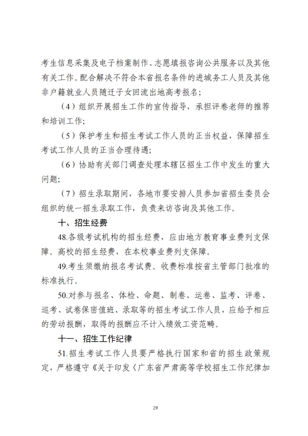 11.严格执行招生政策。各地各校要严格执行国家招生计划和招生政策规定,严肃招生工作纪律,认真遵守高校招生“30个不得”“八项基本要求”等工作纪律,切实维护招生工作的严肃性。高校招生委员会、教育行政部门要认真落实考试招生工作的监管责任,会同教育纪检部门加强对报名、考试、录取全过程监督。要认真做好所属高校招生章程及属地高校的有关特殊类型招生办法的审核工作,对相关高校招生政策及计划执行情况开展督促检查。要严格组织新生入学资格复查,确保招生录取公平公正。