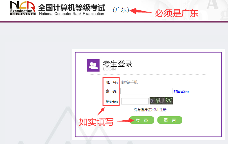 进入报名系统之后,选择【广东省】,用注册好的【通行证】账号和密码登录,如下图: