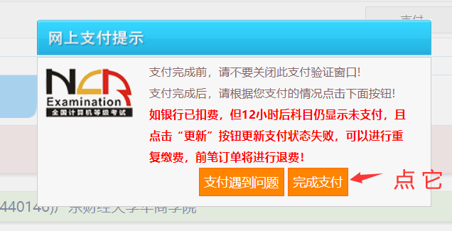 第九步:回到报名系统页面,点【完成支付】,如下图: