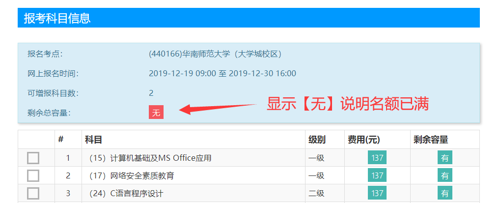 2、如下图,选考点的时候,【剩余总余量】出现【无】的提示,说明名额已满,不能再报这个考点,只能选择其他考点。