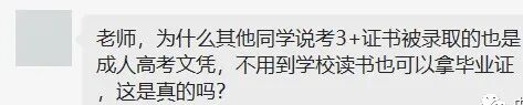 划重点:成人高考不是普通全日制大专/本科,不需要参加普通高考,要参加每年10月份的成人高考,成考的含金量比3+证书入学的全日制文凭要低。