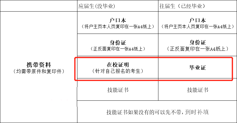 户口本、身份证、技能证书不管应届还是往届都要提供。