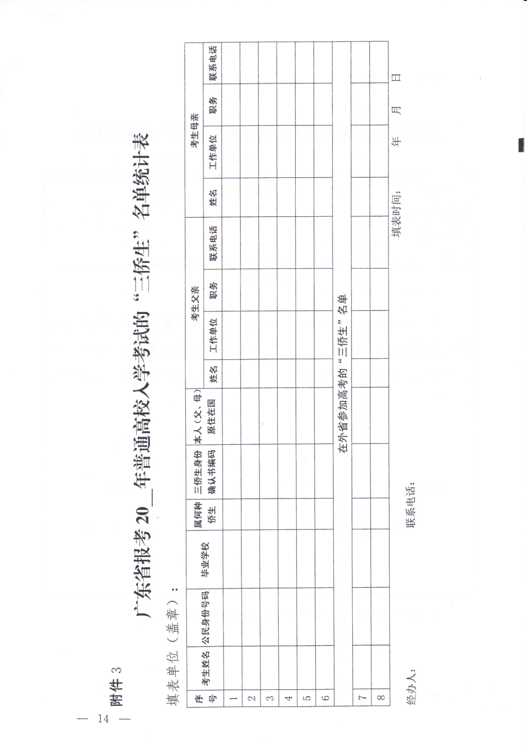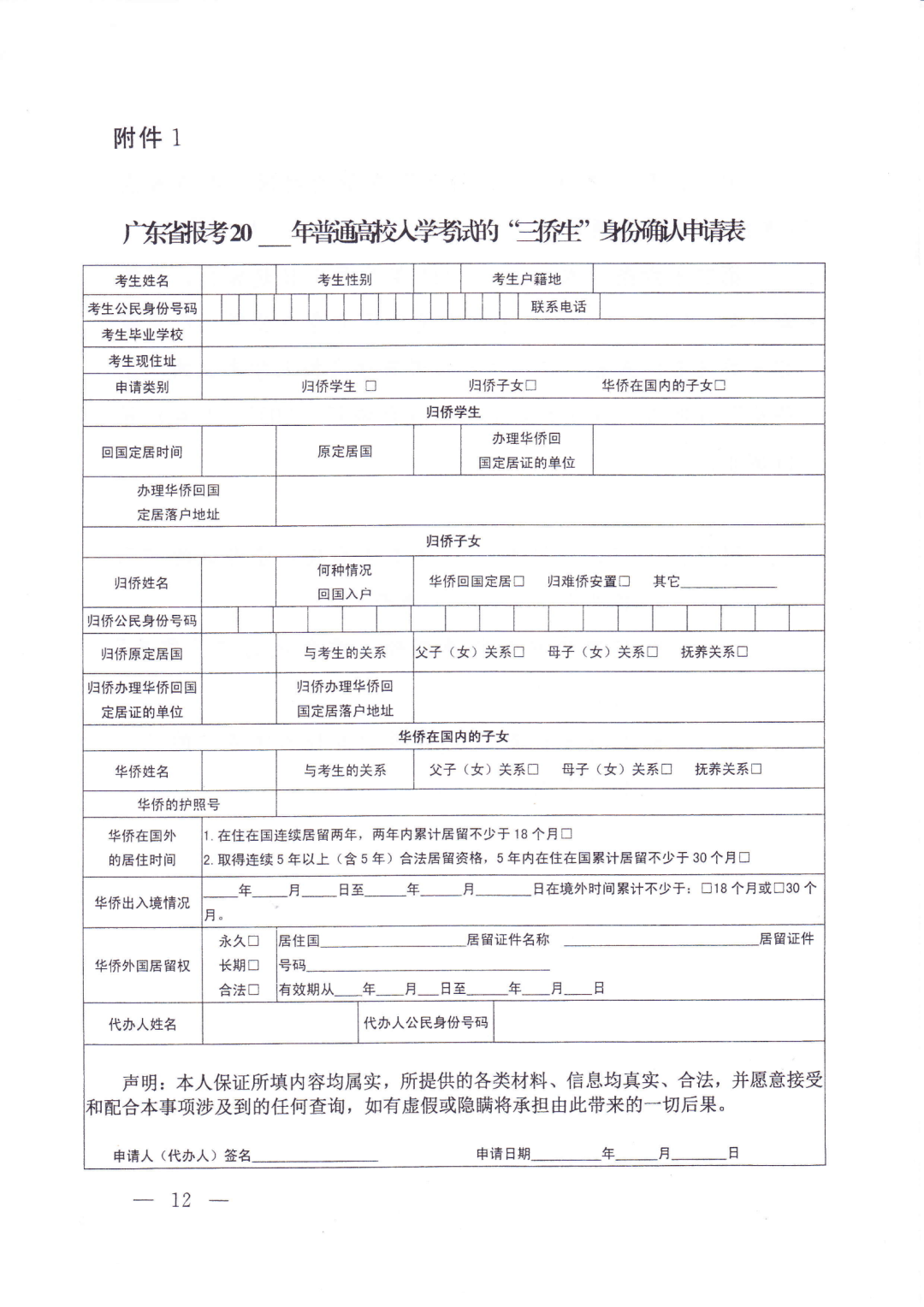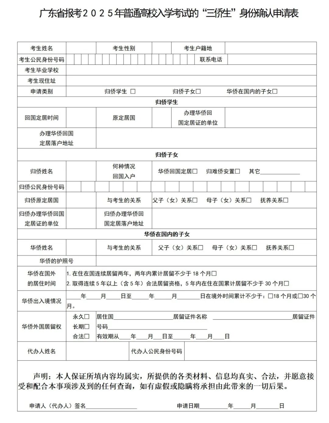 规范填写《广东省报考2025年普通高校入学考试的“三侨生”身份确认申请表》(一式两份,表格可识别二维码下载或到现场领取,个人出入境情况可通过国家移民管理局手机APP“移民局”查询下载),并按所属“三侨生”类别提交相关申请材料(一式两份,现场查验原件)。