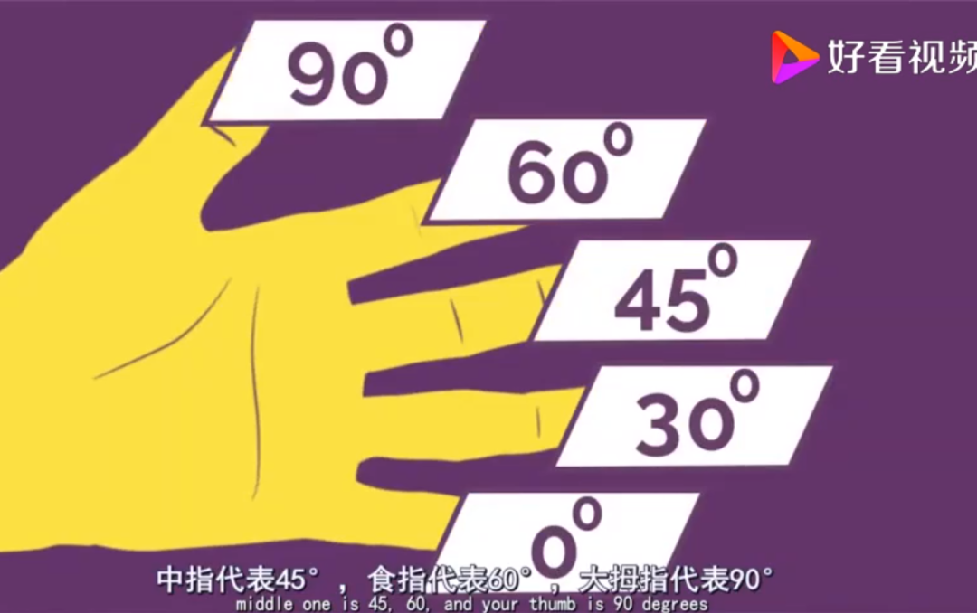 ①手掌心对着自己,自下往上分别是:0°、30°、45°、60°、90°。
