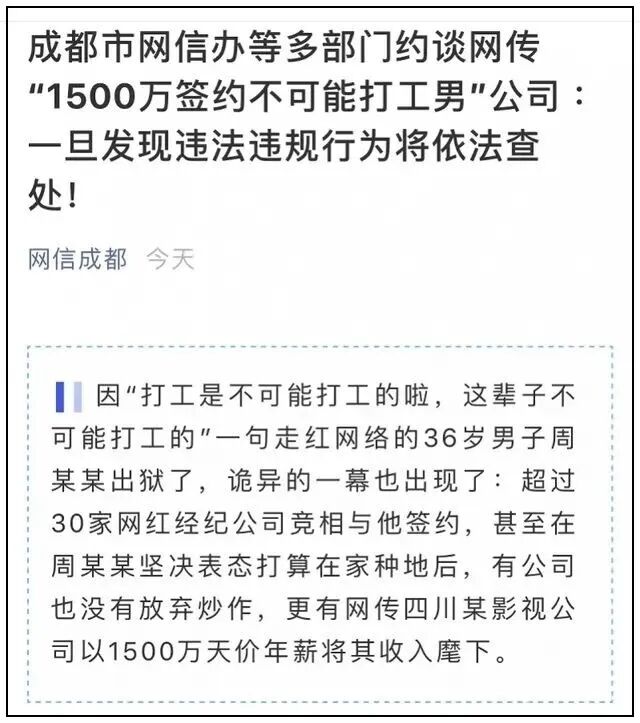 因“打工是不可能打工的啦,这辈子不可能打工的”一句走红网络的36岁男子周某某出狱了,诡异的一幕也出现了:超过30家网红经纪公司竞相与他签约,甚至在周某某坚决表态打算在家种地后,有公司也没有放弃炒作,更有网传四川某影视公司以1500万天价年薪将其收入麾下。