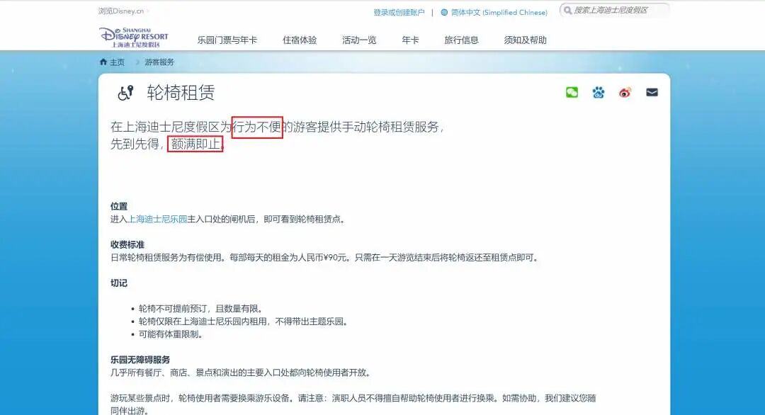 上海迪士尼度假区官网上的轮椅租赁说明。图/上海迪士尼度假区官网截图