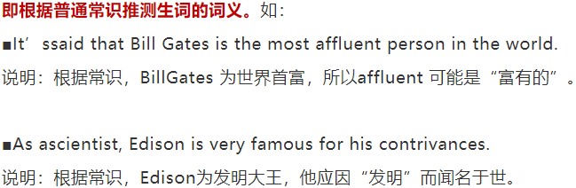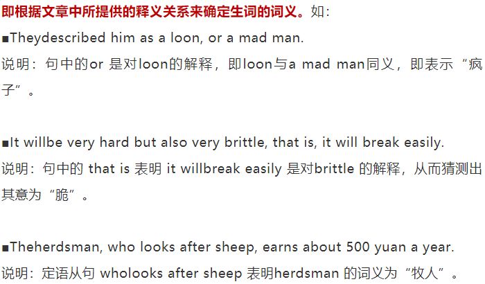即根据文章的前后语境推出生词的词义。如: