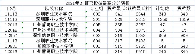 再来看看今年优质公办院校第一次投档情况,专科龙头大哥深圳职业技术学院801专业组投档最低分高达380分。广州番禺职业技术学院806专业组紧接深圳职业技术学院804专业组其后,位居高分院校专业组第7位。