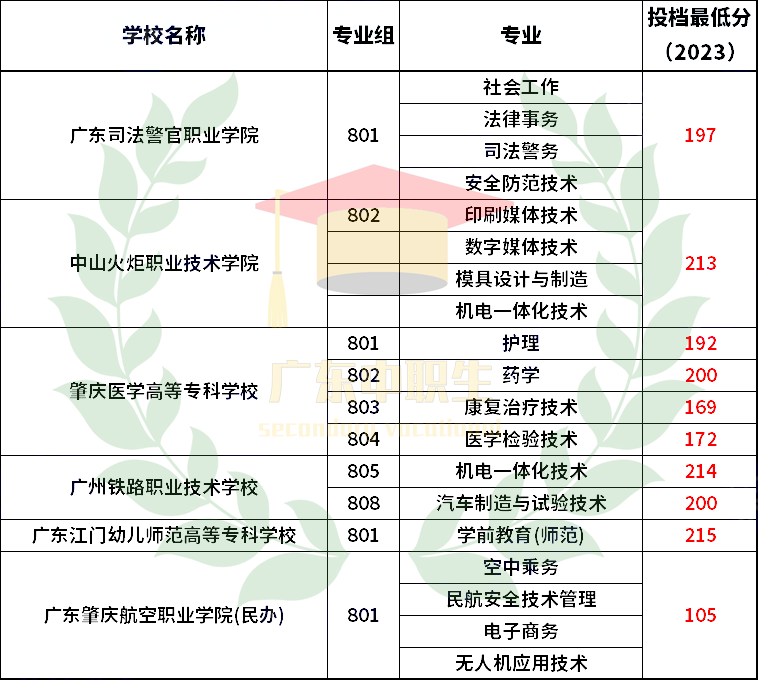 2023年有广东司法警官职业学院 、中山火炬职业技术学院 、肇庆医学高等专科学校 、广州铁路职业技术学校 、广东江门幼儿师范高等专科学校 、广东肇庆航空职业学院(民办) 6所大专院校开设2年制专业。