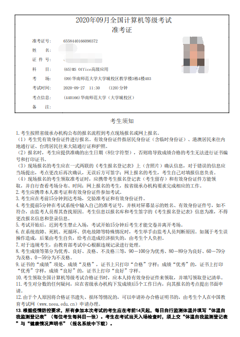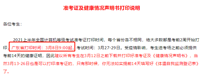 重要通知!广东2021年上半年NCRE考试时间为3月27日-29日,准考证打印时间为3月8日9:00起,同时考生们还需要下载《健康情况声明书》,报名成功的同学千万别忘记打印准考证和《健康情况声明书》!