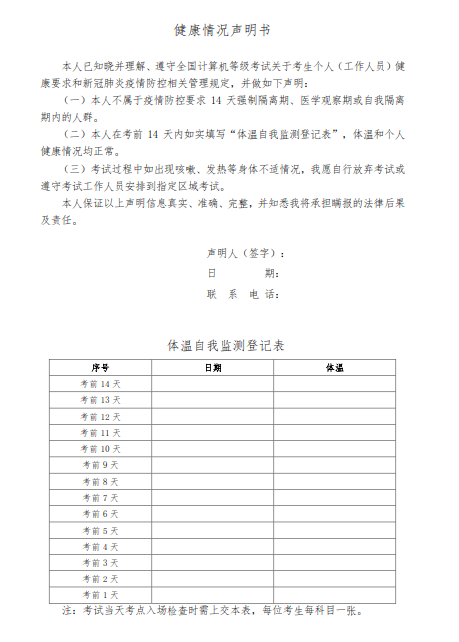 所有考生应在考前14天起,自行每日体温测量,填写“体温自我监测登记表”(每位考生每科目一张),出现身体异常情况的要及时就医并报告。登记表在考试当天入场检查时上交并保留3个月备查。