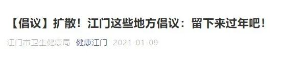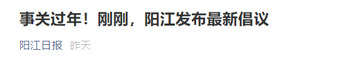 1月12日,阳江市人力资源和社会保障局发文称:疫情防控形势依然严峻复杂。随着春节临近,将迎来人流、物流的高峰,全市疫情防控将面临重大考验,倡议广大市民尽量留阳江过年,非必要不出行,非必要不离阳江,非必要不到中高风险地区。