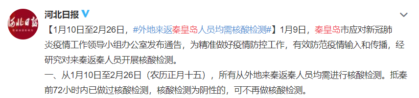 1月9日,秦皇岛市应对新冠肺炎疫情工作领导小组办公室通告,为精准做好疫情防控工作,有效防范疫情输入和传播,经研究对来秦返秦人员开展核酸检测。
